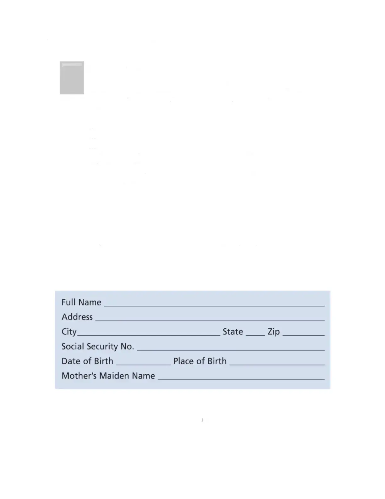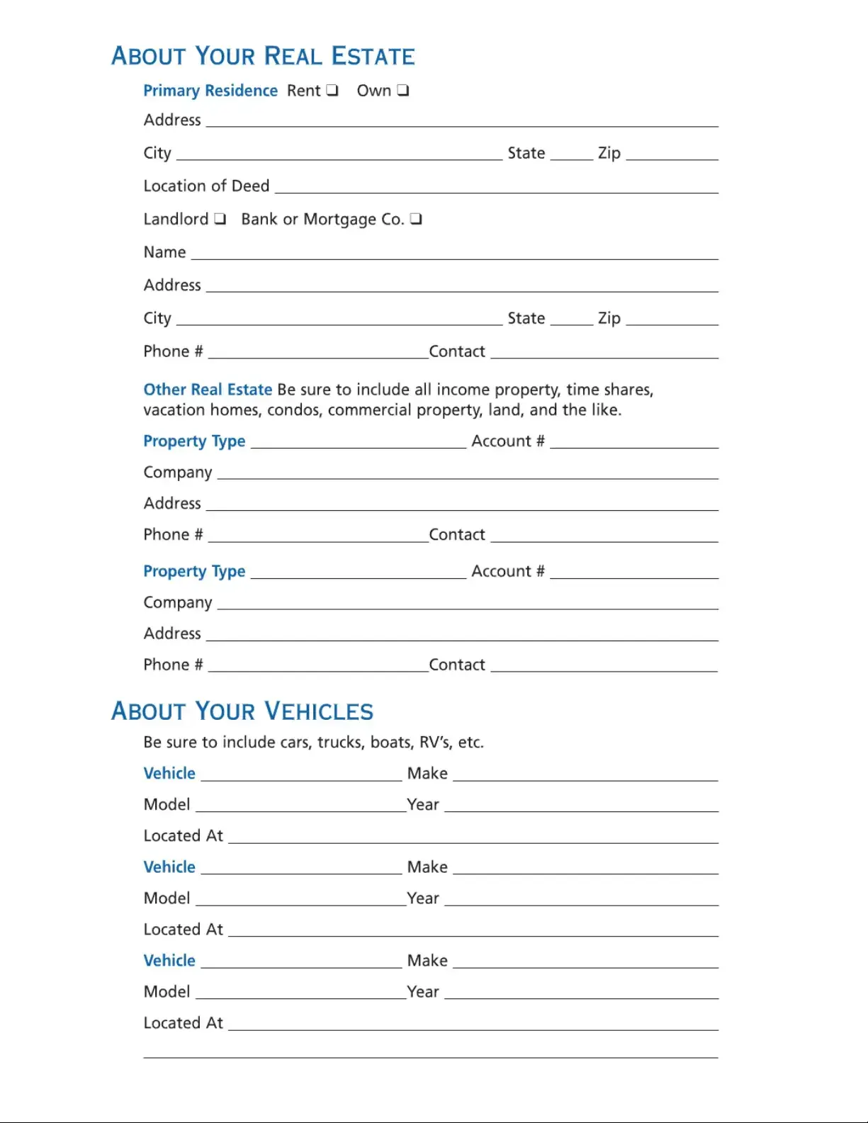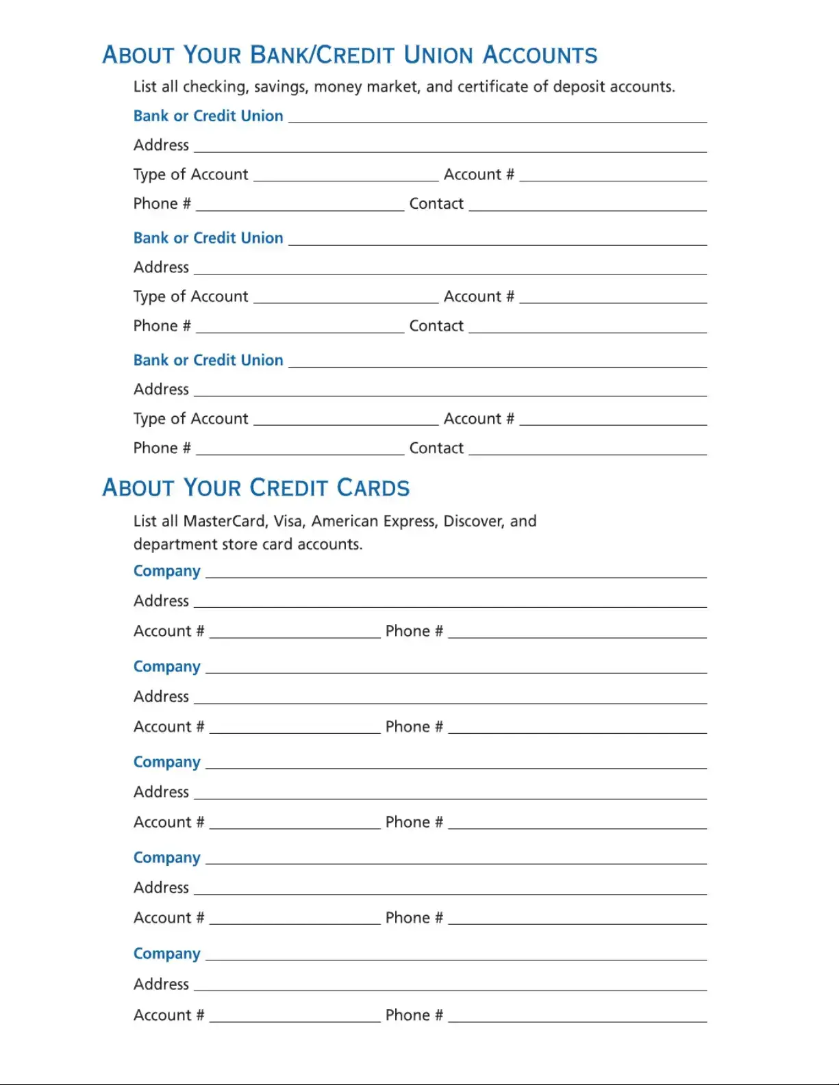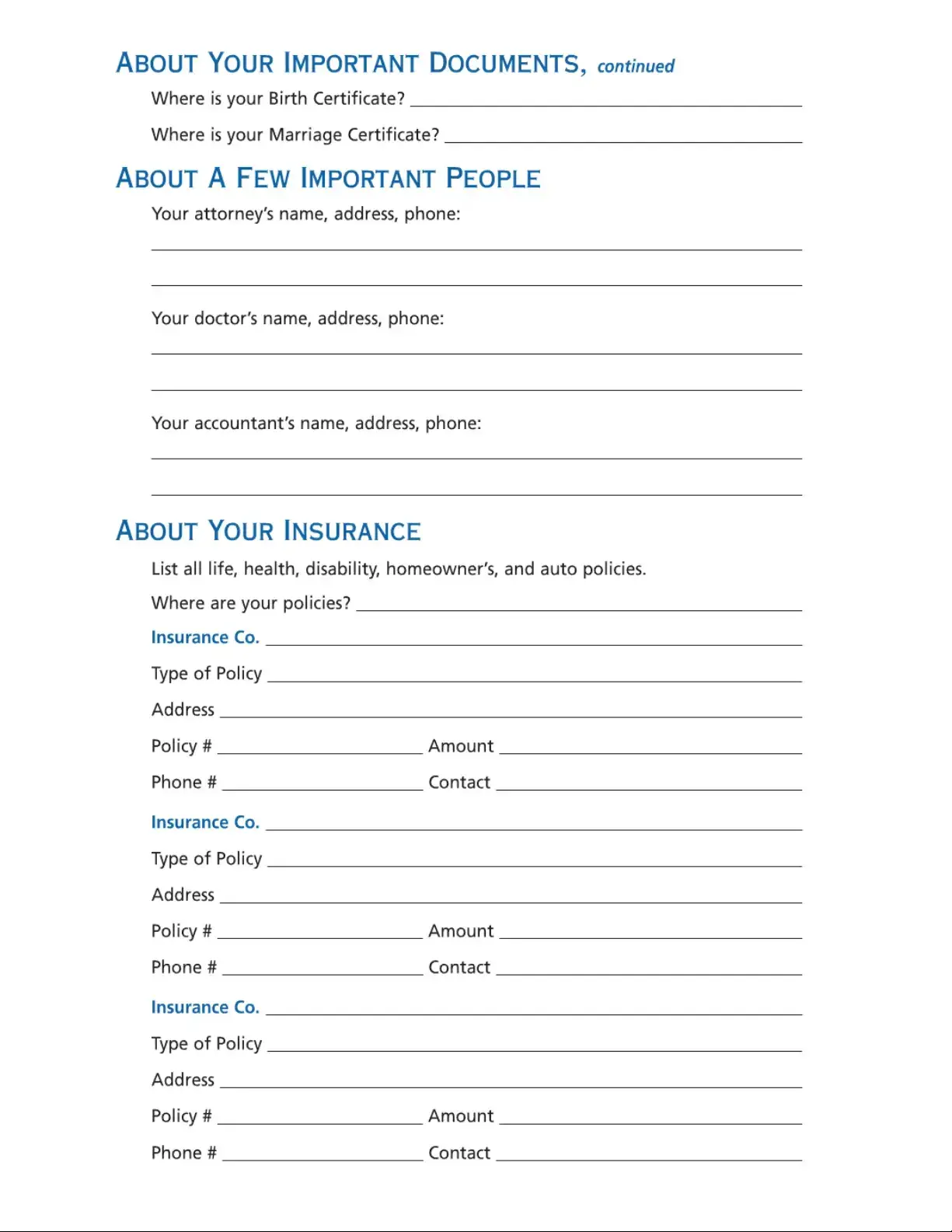 Please take some time to complete the information in this valuable resource guide. (If you need additional room in specific areas, you can add a sheet of paper.) Then, be sure to go over the information with a trusted family member or friend, put this guide in a safe place, and tell that person where the safe place is for their future reference. We also recommend that you review the information periodically and keep it up-to-date.