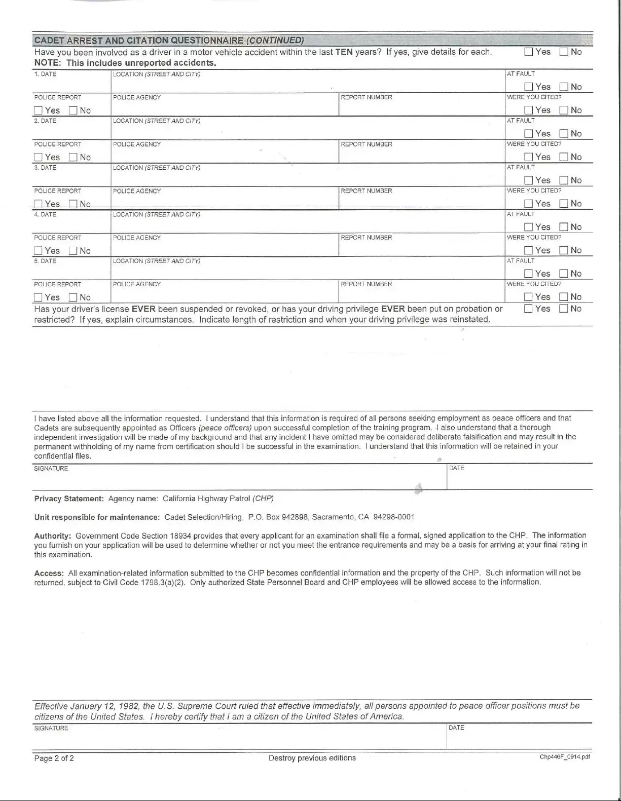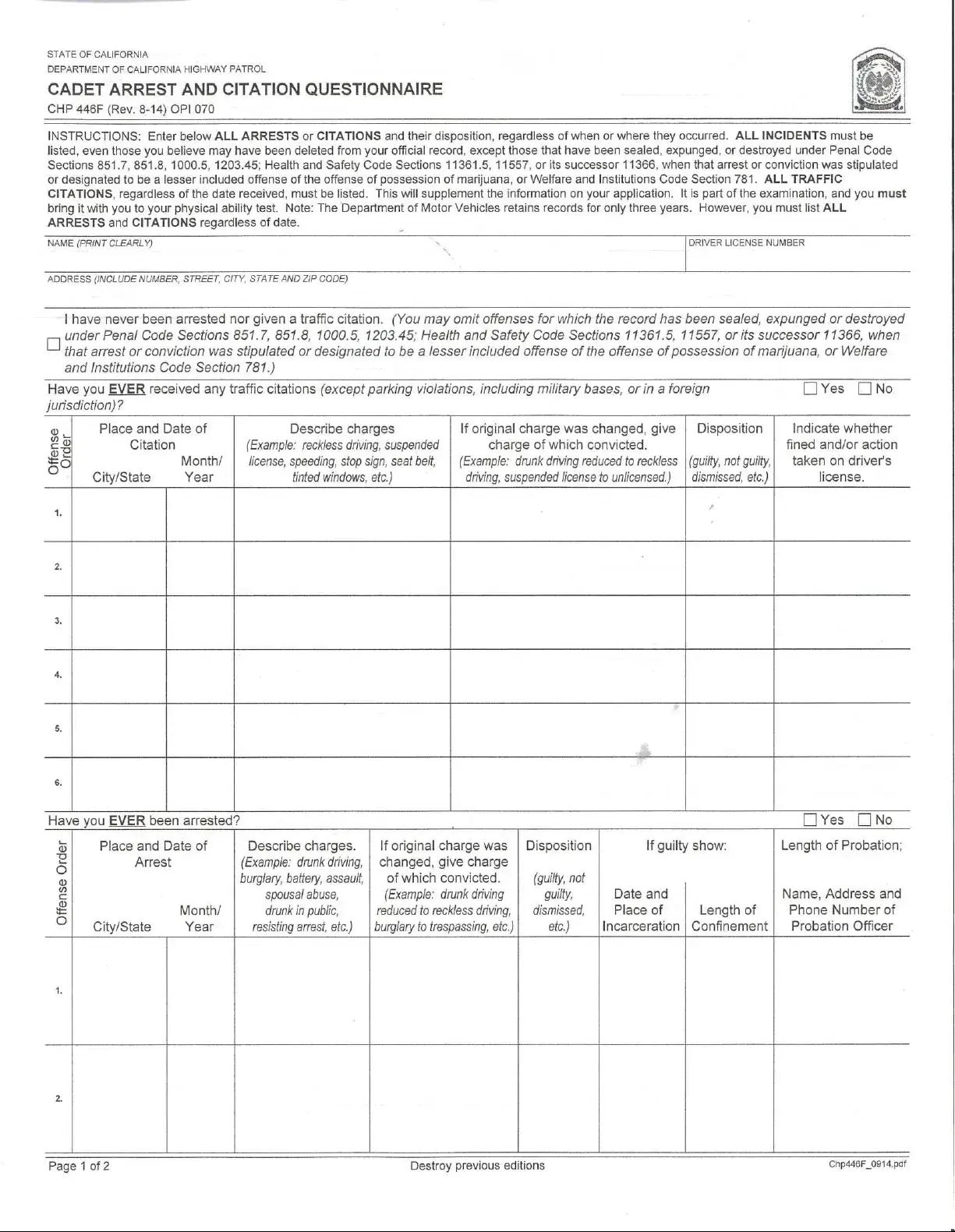 Anyone applying for a cadet position with the CHP must complete the CHP 446F form. This includes individuals who have never been arrested or cited, as they still need to affirm that they have no relevant incidents to report.