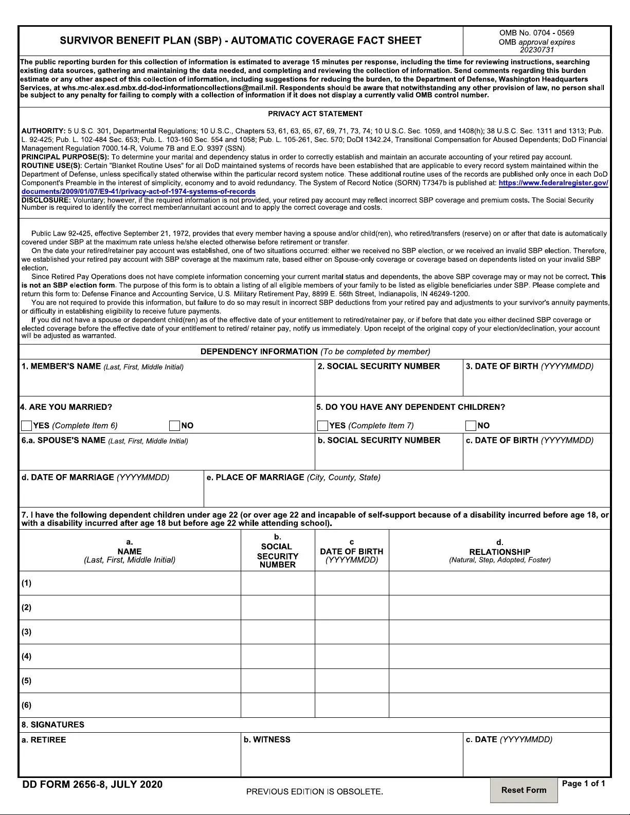 The DD Form 2656-8, also known as the Survivor Benefit Plan (SBP) Automatic Coverage Fact Sheet, is designed to collect information regarding your marital and dependency status. This information helps establish and maintain accurate records for your retired pay account. It ensures that your SBP coverage and premium costs are calculated correctly based on your current family situation.