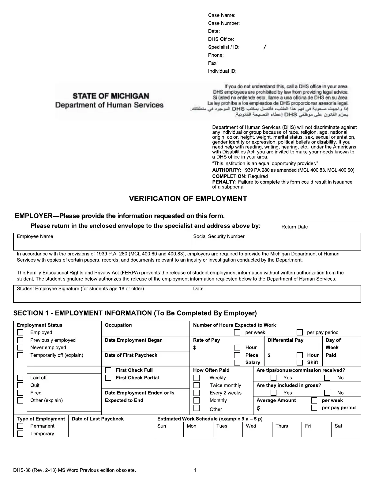 The DHS 38 form is an essential document utilized by the Michigan Department of Human Services to gather critical employment and income information from employers. This form plays a significant role in various inquiries and investigations, ensuring that the Department can accurately assess eligibility for assistance programs. Employers are required to provide detailed information about the employee’s employment status, including job title, hours worked, and pay rates. Additionally, the form collects vital data regarding health insurance and retirement plans, which can impact an individual’s benefits. By signing the form, employees authorize the release of their employment details, complying with privacy regulations such as the Family Educational Rights and Privacy Act. It is crucial for employers to complete this form accurately and return it by the specified deadline to avoid potential legal consequences, including the issuance of a subpoena. The DHS 38 form is not just a bureaucratic requirement; it serves as a vital tool for ensuring that individuals receive the assistance they need while maintaining compliance with state regulations.