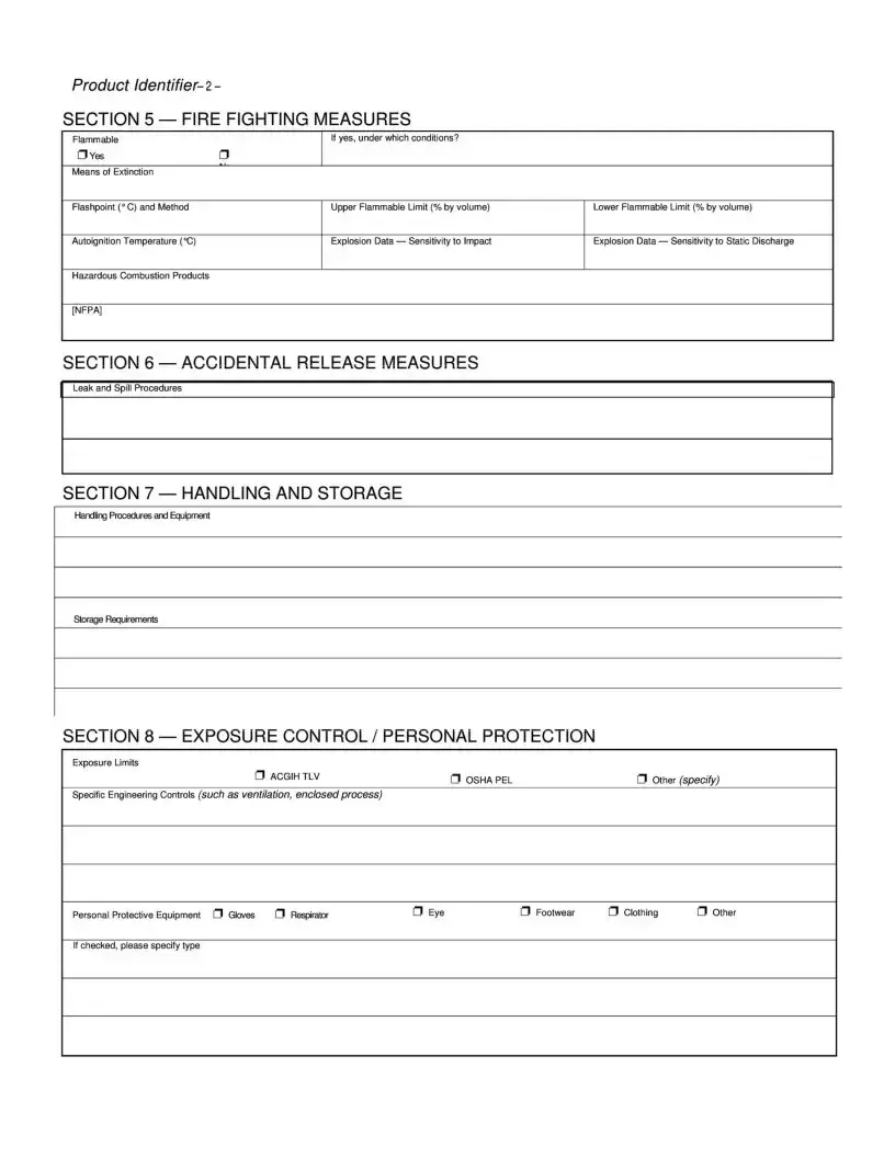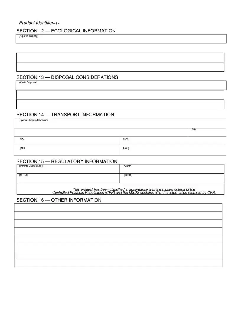 The Material Safety Data Sheet (MSDS) is an essential document designed to provide comprehensive information about a chemical product, ensuring safety for those who handle it. This form is divided into 16 sections, each serving a specific purpose. It begins with identifying the chemical product and the manufacturer, including contact details for emergencies. The composition section outlines hazardous ingredients, their concentrations, and relevant safety data, like toxicity levels. Hazards associated with the product are clearly identified, including potential health effects from skin contact, inhalation, or ingestion. First aid measures are detailed to guide immediate responses in case of exposure. Fire safety information, including flammability and means of extinguishing fires, is crucial for workplace safety. Procedures for accidental releases are also included to mitigate risks in case of spills. The MSDS further addresses handling and storage recommendations, exposure controls, and personal protective equipment necessary for safe use. Physical and chemical properties of the product are provided, along with stability and reactivity information to understand how the substance behaves under various conditions. Toxicological information highlights the effects of acute and chronic exposure, while ecological data assesses environmental impacts. Disposal considerations ensure compliance with regulations, and transport information outlines any special shipping requirements. Finally, regulatory information confirms that the product meets safety standards. Each section of the MSDS plays a vital role in promoting safe practices in workplaces that utilize hazardous materials.