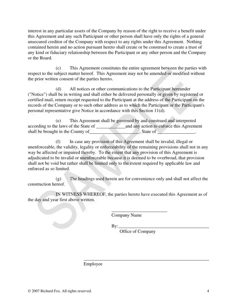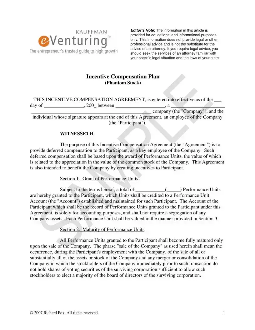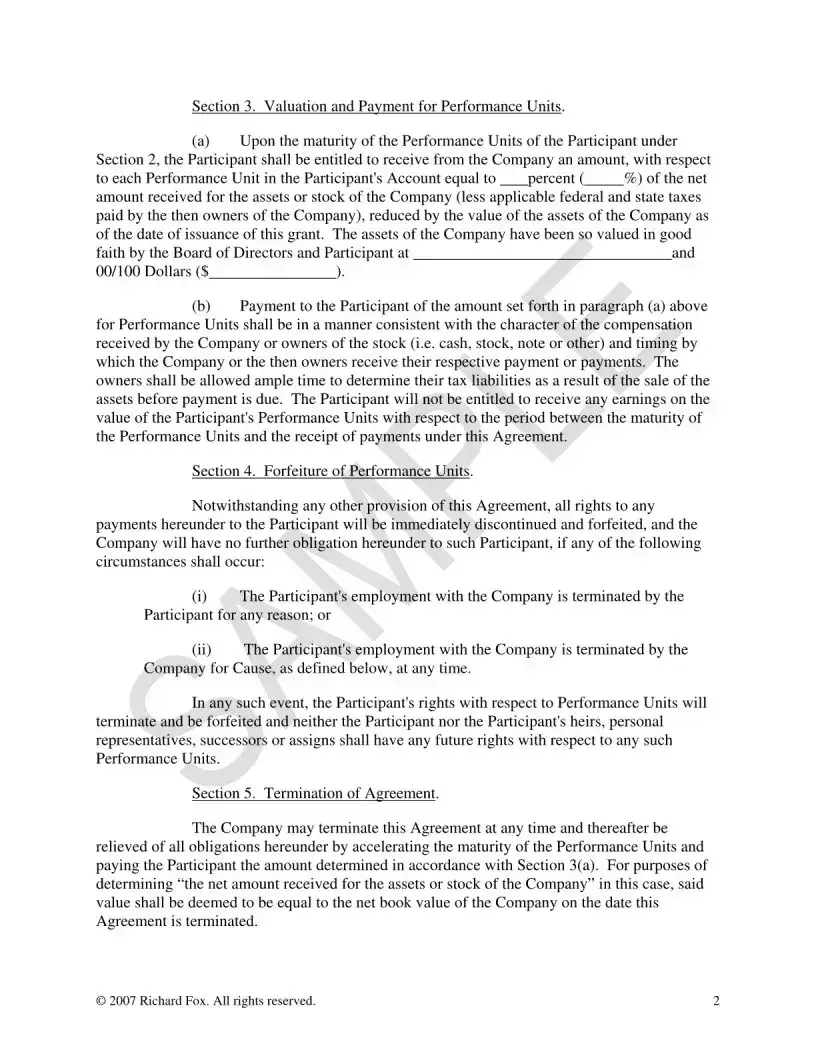 The Phantom Compensation Plan form serves as a crucial document for companies looking to incentivize key employees through deferred compensation. This form establishes an Incentive Compensation Agreement between the company and the employee, referred to as the Participant. The primary aim is to reward the Participant based on the performance of the company's stock, specifically through the granting of Performance Units. These units are recorded in a Performance Unit Account, which is strictly for accounting purposes and does not require the segregation of company assets. The form outlines the conditions under which these Performance Units mature, typically contingent upon the sale of the company or a significant merger. Upon maturity, the Participant is entitled to receive a specified percentage of the net proceeds from the sale, after accounting for taxes and the company's asset valuation. Additionally, the agreement includes provisions for forfeiture of rights to the Performance Units if the Participant's employment is terminated for any reason, emphasizing the importance of continued employment for the benefits to be realized. The company also retains the right to terminate the agreement, accelerating the maturity of the Performance Units and fulfilling its obligations by paying the determined amount. This structured approach not only aligns the interests of the Participant with the company's performance but also provides a clear framework for compensation and potential risks involved.