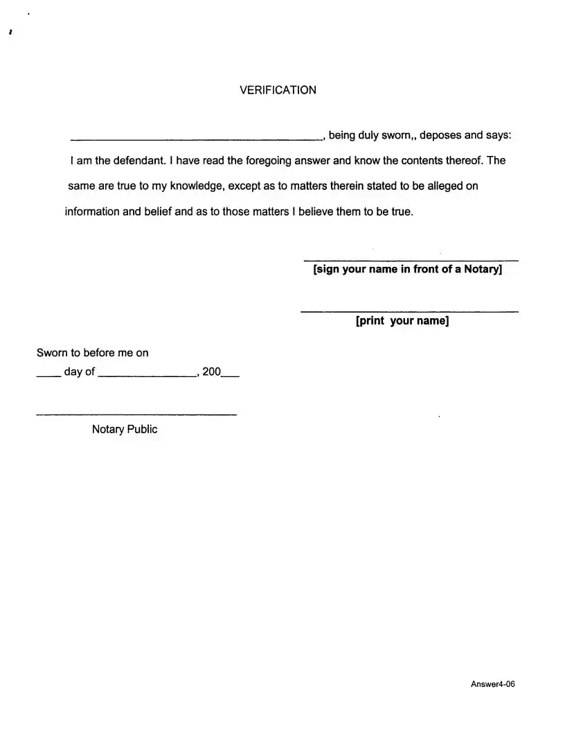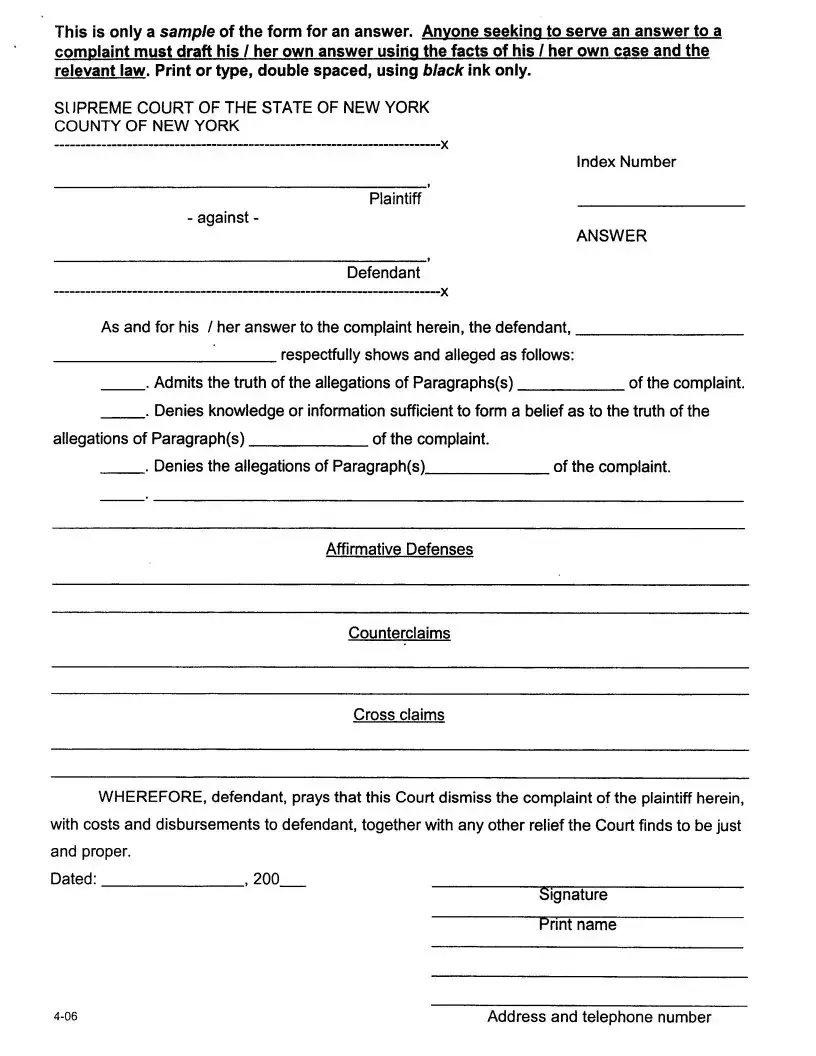 An Answer is a detailed response to the allegations made in the complaint. It includes the case caption and a series of numbered paragraphs responding to each allegation. The defendant can either admit, deny, or claim insufficient knowledge regarding each allegation. Additionally, the Answer may include affirmative defenses, which are legal reasons that justify the defendant's position in the case.
